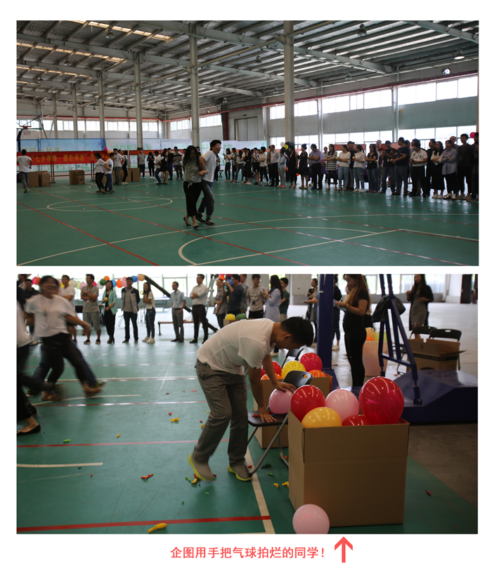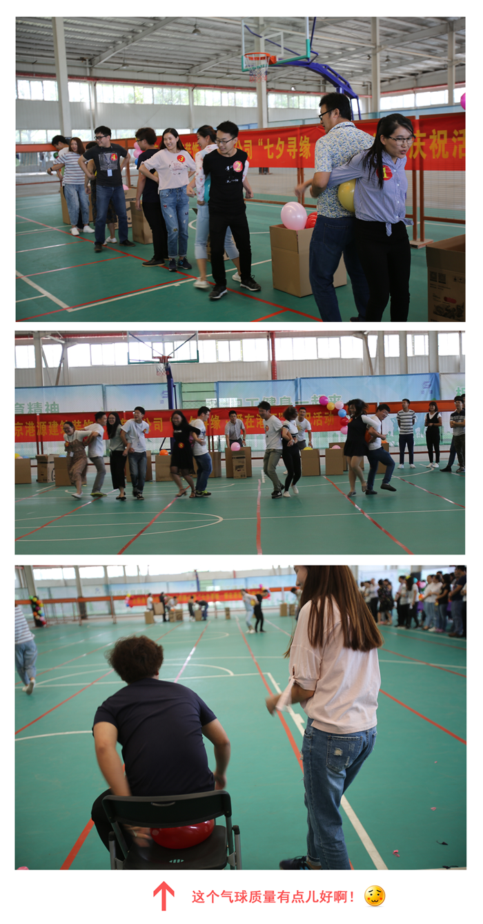 【游戲規則:男女搭配背靠背夾住氣球,從起點跑至終點并把氣球坐炸,以坐炸氣球的數量判斷勝負。】