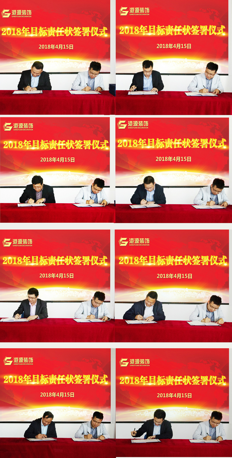 為全面落實公司年度戰(zhàn)略目標,強化績效和激勵機制,4月15日,港源裝飾各運營分公司在會議上簽署了2018年度目標責任狀,并明確地將年度目標層層下達,使“年初有計劃、年底有考核”的閉環(huán)管理模式真正實現(xiàn)落地!
