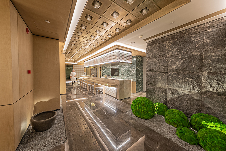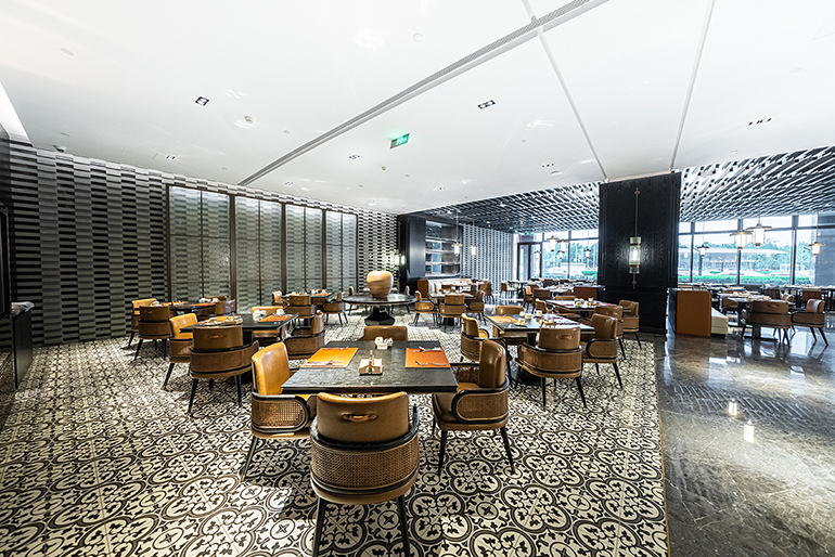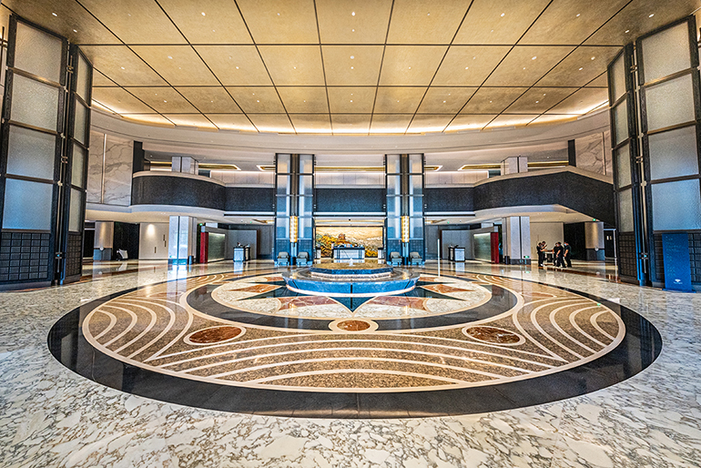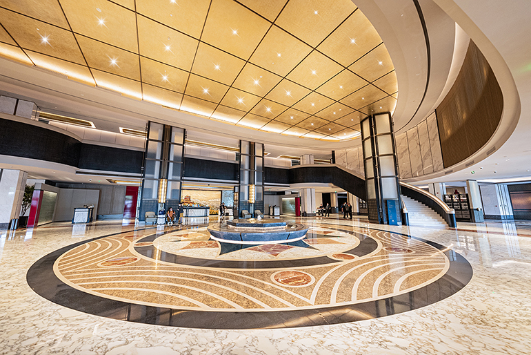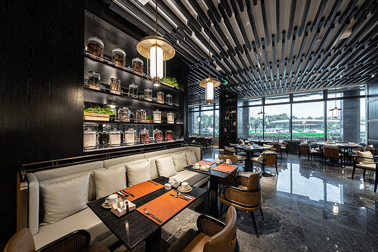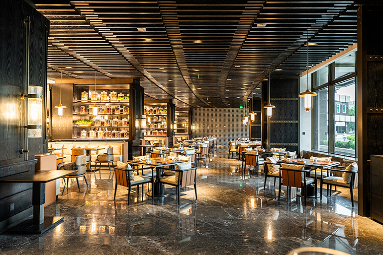 這是一座無(wú)法批量施工的項(xiàng)目:氣勢(shì)恢宏的無(wú)柱宴會(huì)廳、素潔靜雅的辰山中餐廳、中西合璧的新福席特色餐廳……每個(gè)空間都有其獨(dú)特的美學(xué)蘊(yùn)含,僅在港源施工范圍內(nèi)的空間就涉及