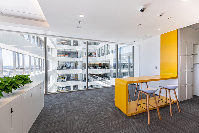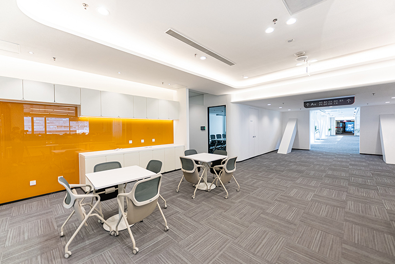 港源裝飾項目團隊深刻理解裝修材質及色彩把控對空間塑造的重要性,在施工過程中靈活運用漸進色、反差跳色,在以尚白為基礎色調的辦公區域,通過背漆玻璃的青白、木飾面固裝和無機涂料的乳白、鋼板天花的啞光白、鋁板飾面的雪白、瓷磚的米白,在簡約中和諧地創造了豐盈的立體視覺享受,規避了呆板單一的視覺效果,創造了一個層次遞進的白色美學空間。