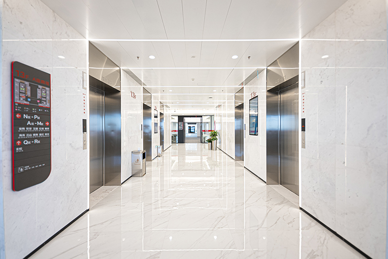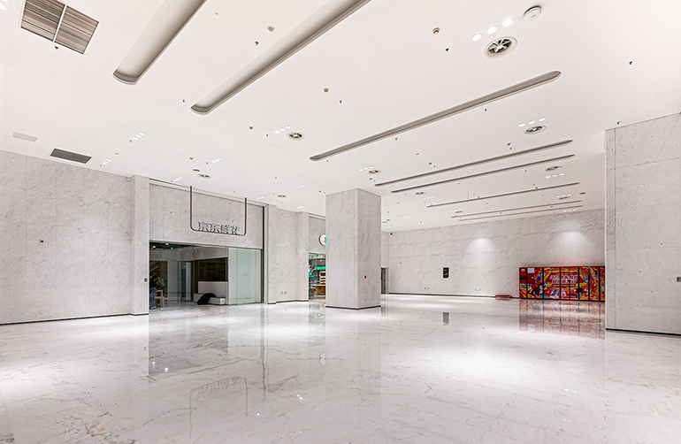 京東集團總部二期的地下一層訪客大堂結構挑高9米,大堂周邊墻體大部分二次結構為連鎖砌塊砌筑,且結構受力復雜。港源裝飾項目團隊經過多方溝通及計算預排版,決定采用穿墻螺栓預焊接、墻體雙側對應布設埋板、局部連鎖砌塊灌注混凝土等綜合方式進行鋼架龍骨焊接埋板的固定,以此規避了連鎖砌塊墻無法承重的缺陷,不僅避免增加甲方成本,也為大堂大空間墻面石材干掛的安全、穩定加上一道“雙保險”。